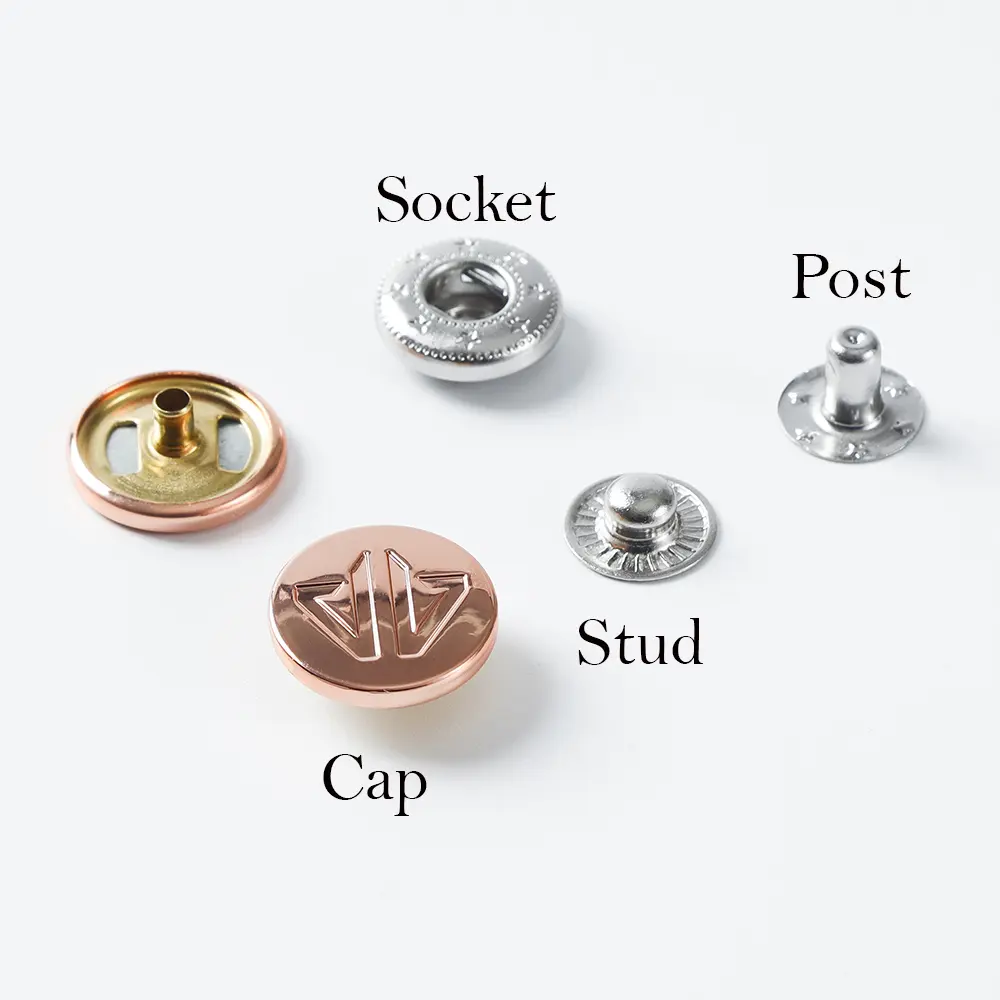 按扣由四个部分组成。“面件”和“母扣”相互配合,位于衣服的最外侧。这是按扣中可以看到的部分。“公扣”和“底钉”将在背面合在一起。